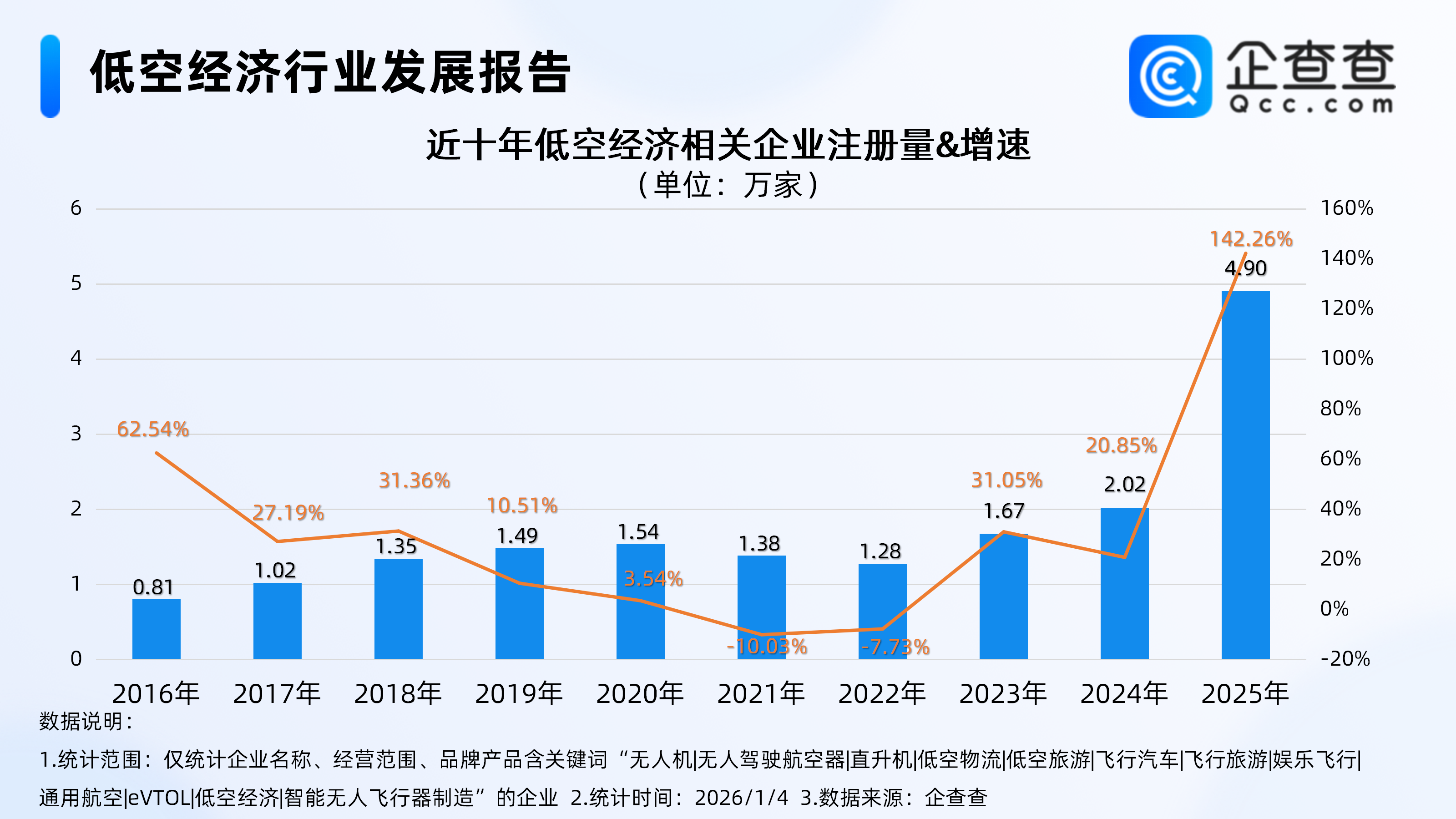 企查查數據顯示,注冊量方面,2016年-2022年低空經濟年注冊量基本維持在1.5萬家以內,2023年以來低空經濟相關企業注冊量呈逐年增長趨勢,2025年注冊量同比增長142.26%至4.9萬家,達近十年來注冊量及增速雙高峰。
