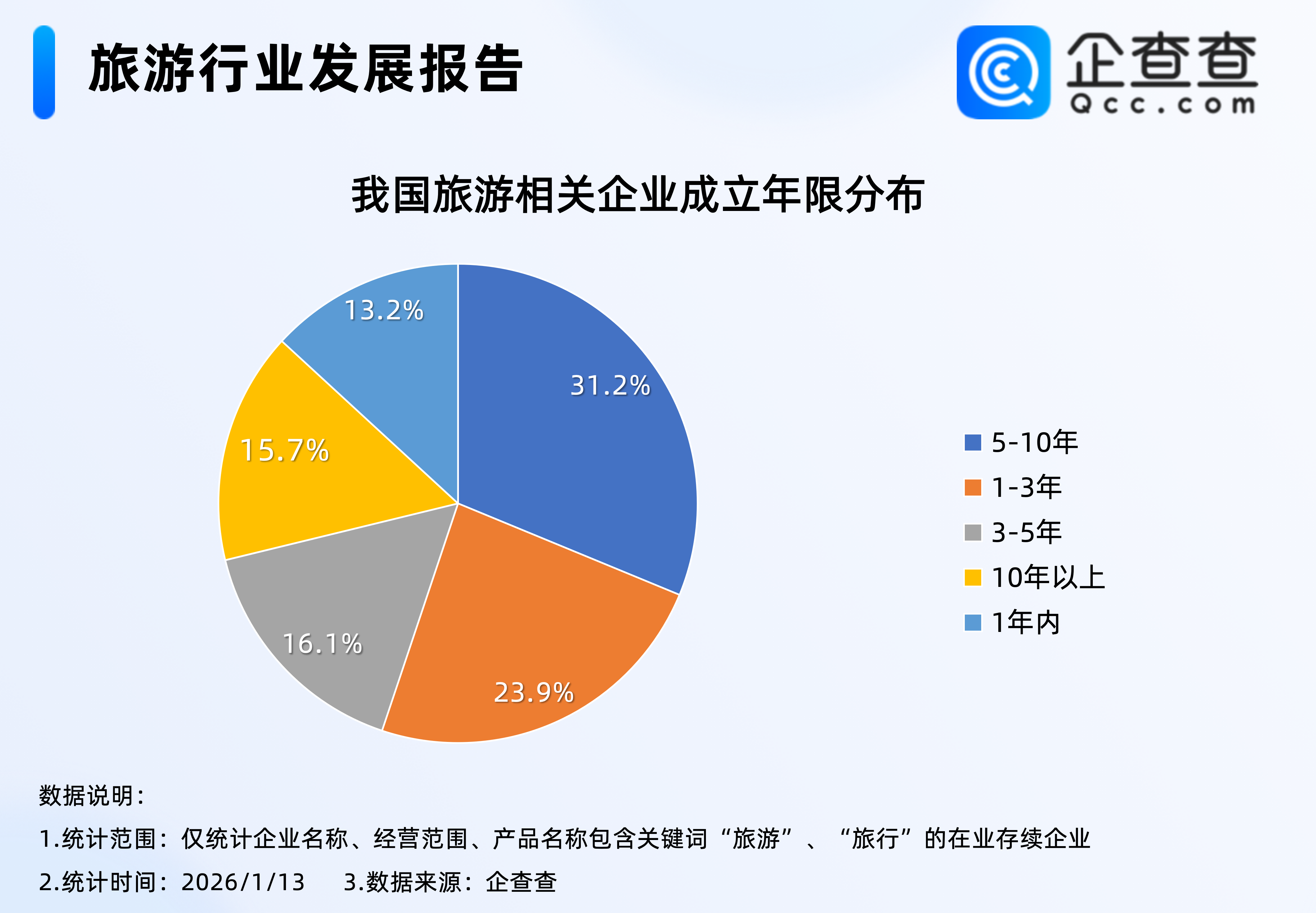 企查查數據顯示,截至1月13日,我國現存235萬家旅游相關企業,成立年限分布相對均勻,其中成立5至10年之間的企業最多,占比31.2%,其次是成立1至3年之間的企業,占比23.9%。