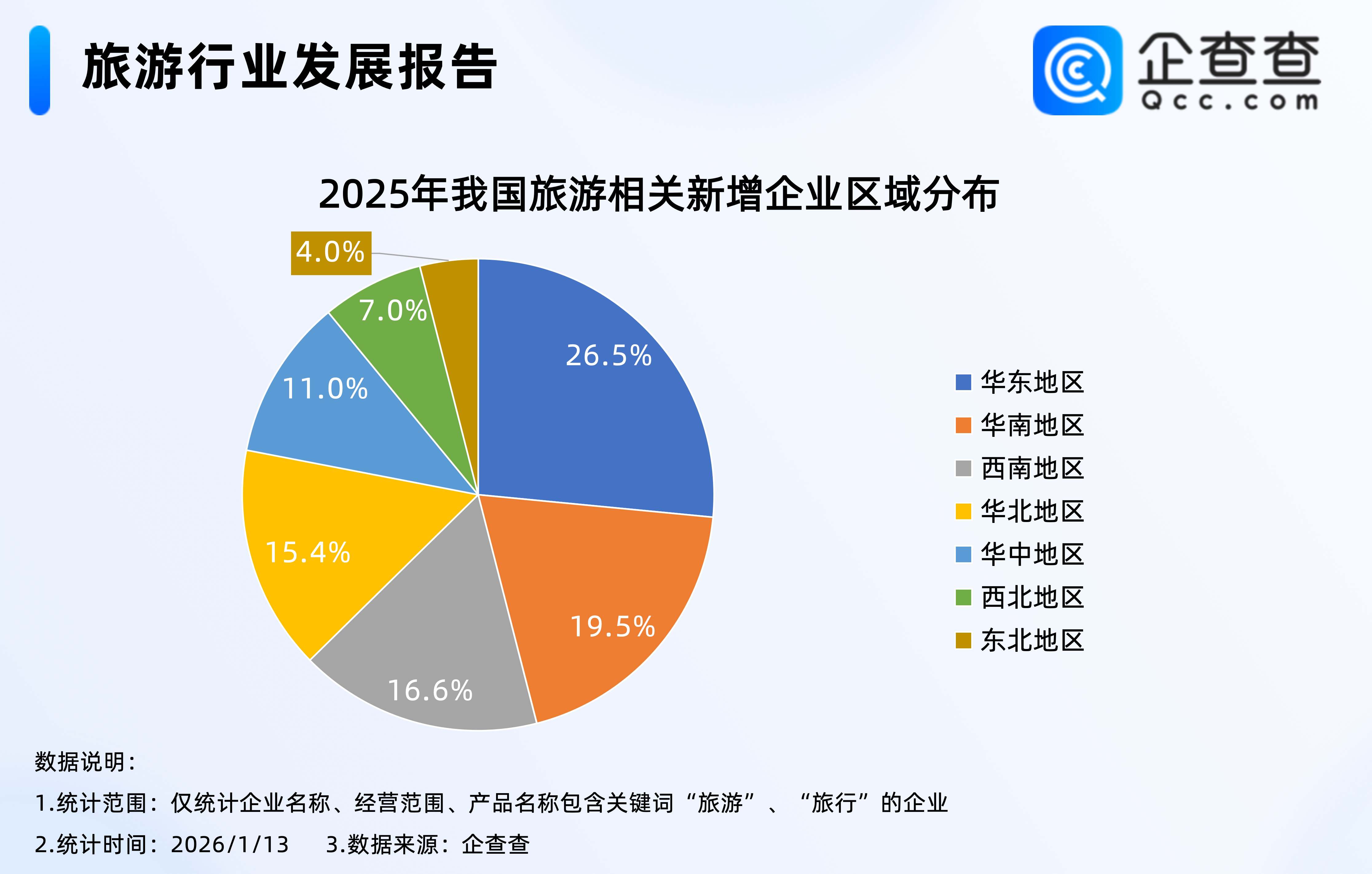 企查查數據顯示,2025年以來新注冊的32萬余家旅游相關企業中,位于華東地區的相關企業最多,占比26.5%,其次是華南地區,占比19.5%,東北地區相對最少,占比4.0%。