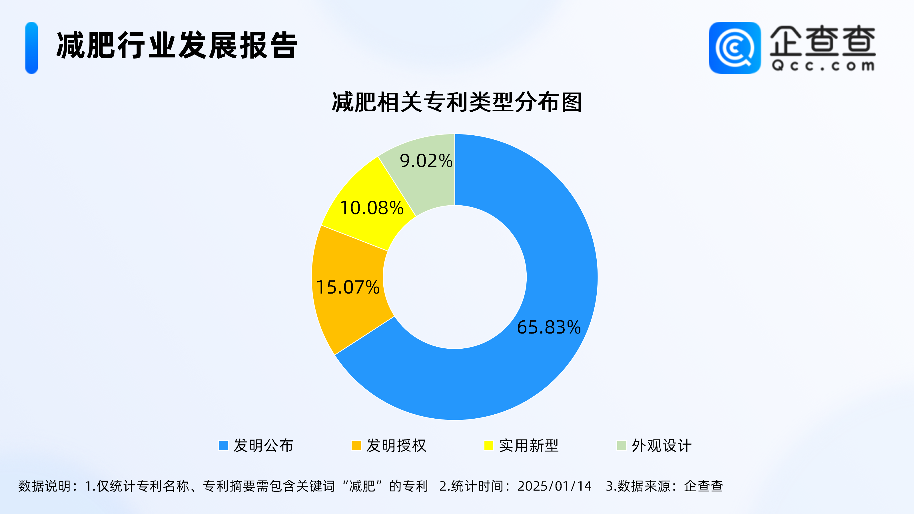 企查查數(shù)據(jù)顯示,從專利類型分布來看,減肥相關(guān)專利多為發(fā)明專利,占比超八成,其中發(fā)明公布專利最多,占比65.83%。其次,發(fā)明授權(quán)專利占比15.07%。實用新型專利、外觀設(shè)計專利分別占比10.08%、9.02%。