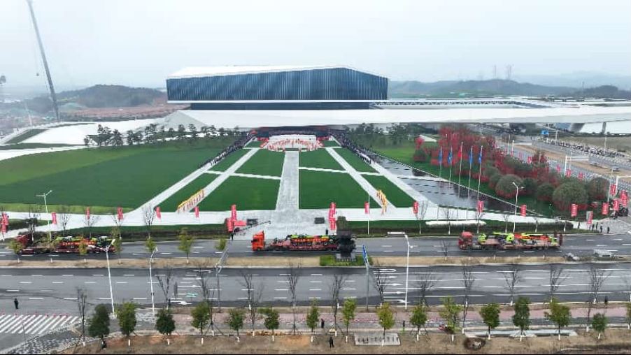 作為本次開門紅活動的核心環節,發車儀式萬眾矚目。上午9時28分,隨著一聲“發車”號令,現場彩煙騰空、鼓點如虹,中聯智慧產業城四大園區同時發車,滿載著高端、智能、綠色產品的車隊浩浩蕩蕩從園區出發,經過總部大樓接受檢閱,駛向全球。