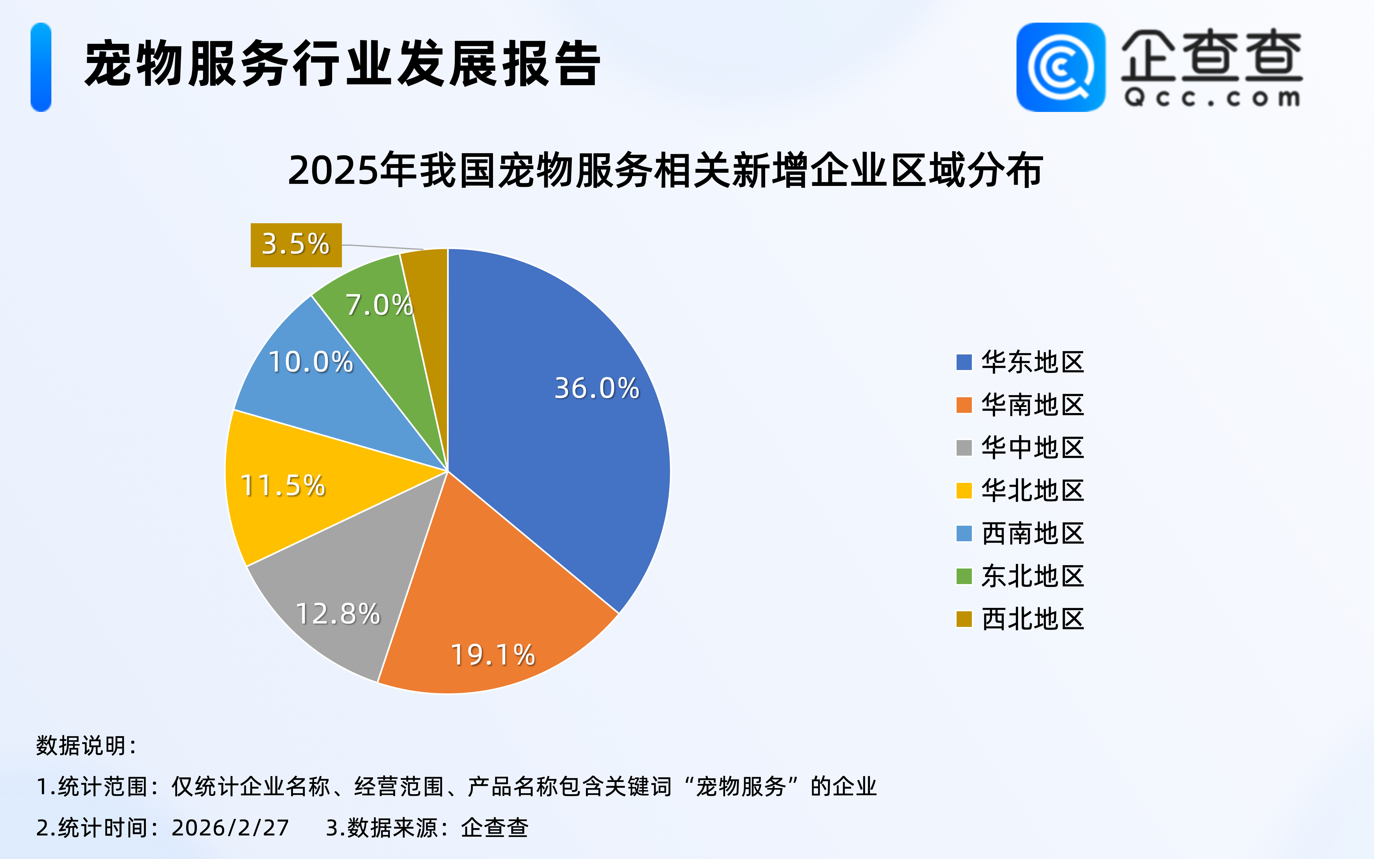 企查查數據顯示,2025年注冊的13.9萬家寵物服務相關企業中,位于華東地區的相關企業最多,占比達36.0%,其次是華南地區,占比19.1%,西北地區2025年寵物服務相關企業注冊量相對最少,占比3.5%。