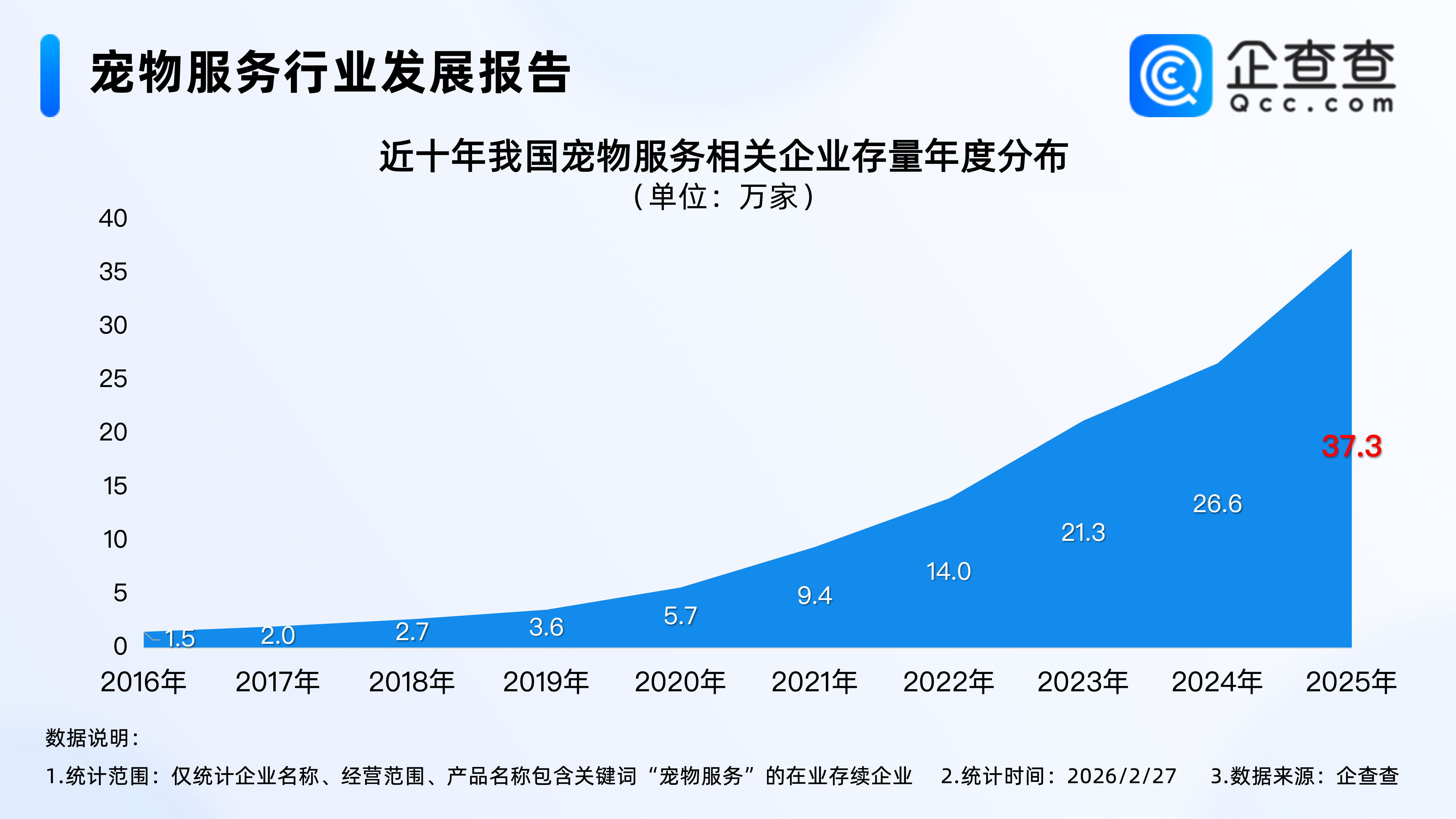 企查查數據顯示,近十年,我國寵物服務相關企業存量逐年增加,尤其是2021年以來,增速加快,2023年我國寵物服務相關企業存量首次突破20萬家,達21.3萬家;2025年年底,我國在業存續37.3萬家寵物服務相關企業。截至2026年2月27日,我國現存38.7萬家寵物服務相關企業。