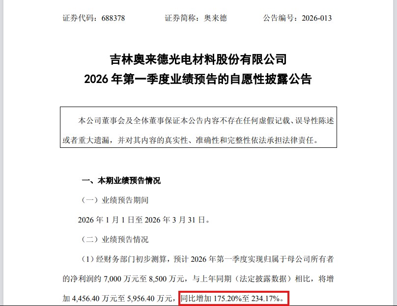 股價剛剛續創歷史新高的奧來德(688378)今日盤后又公布了2026年第一季度業績預喜的消息。