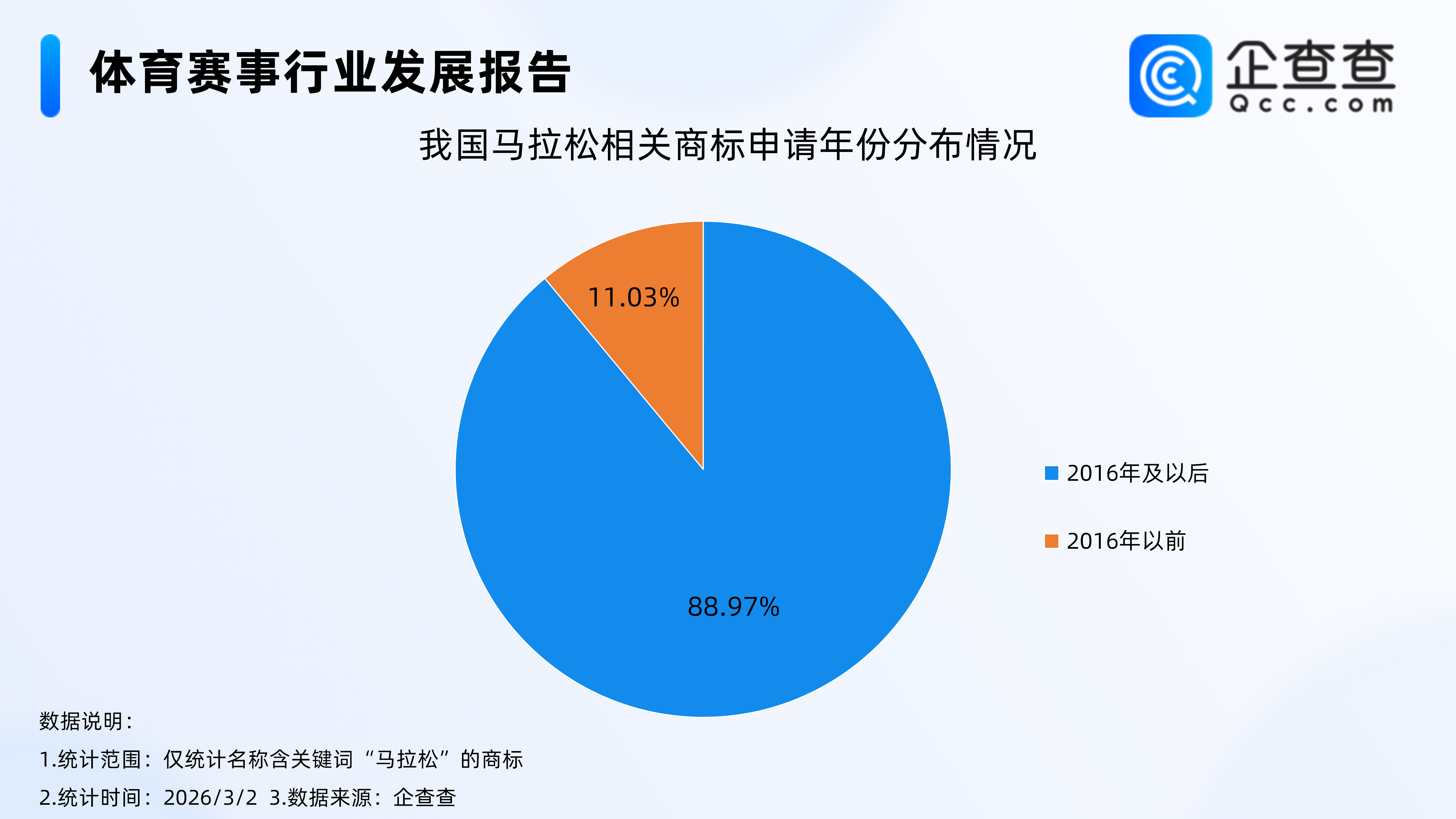 過去十多年,國內馬拉松迎來爆發式增長,企查查數據顯示,國內關鍵詞含馬拉松的相關商標數量已超2700枚,其中近9成申請注冊于近十年(即2016年及以后),占比達88.97%。‌‌