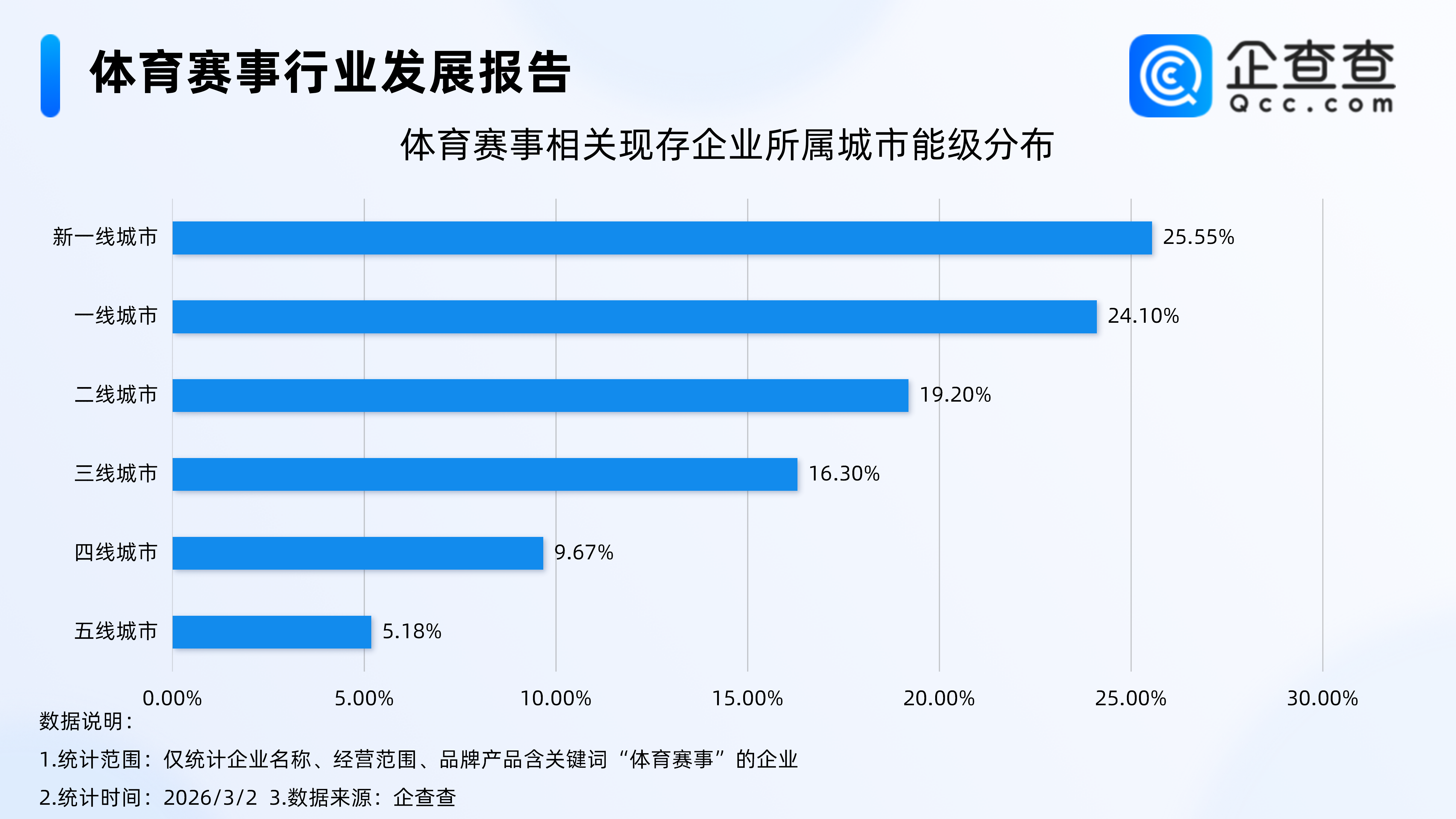 企查查數據顯示,截至3月2日,國內體育賽事相關現存企業達83.48萬家,主要分布在新一線、一線城市,分別占比25.55%、24.1%。分布在二線、三線城市的相關企業占比均在20%以下,分布在四、五線城市的相關企業占比均不足10%。