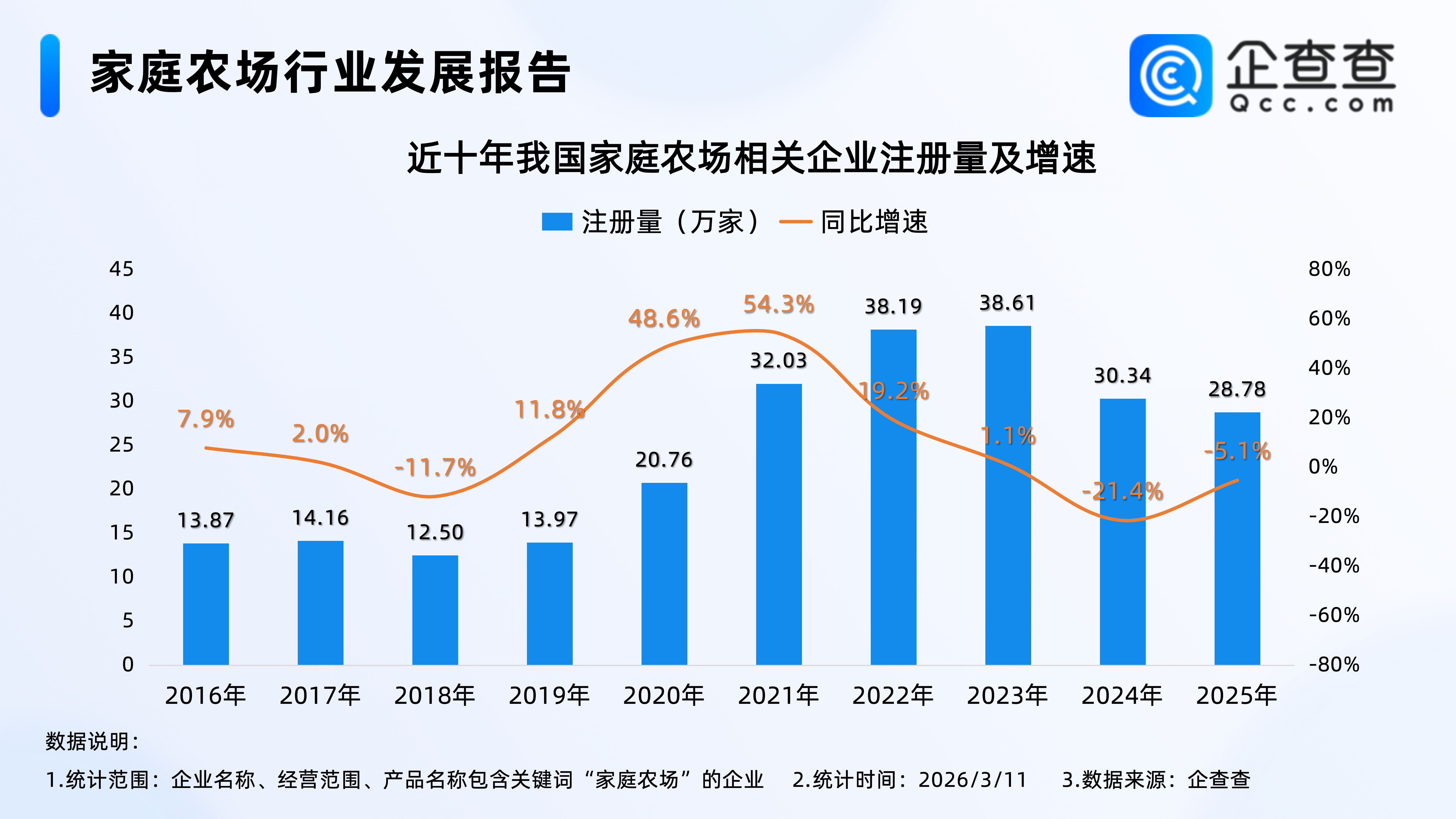 企查查數據顯示,近十年,我國家庭農場相關企業每年注冊量區間從12萬家-15萬家逐漸抬升至28萬家-40萬家,2025年全年,我國累計注冊28.78萬家家庭農場相關企業,截至3月11日,2026年我國已注冊4.66萬家家庭農場相關企業。