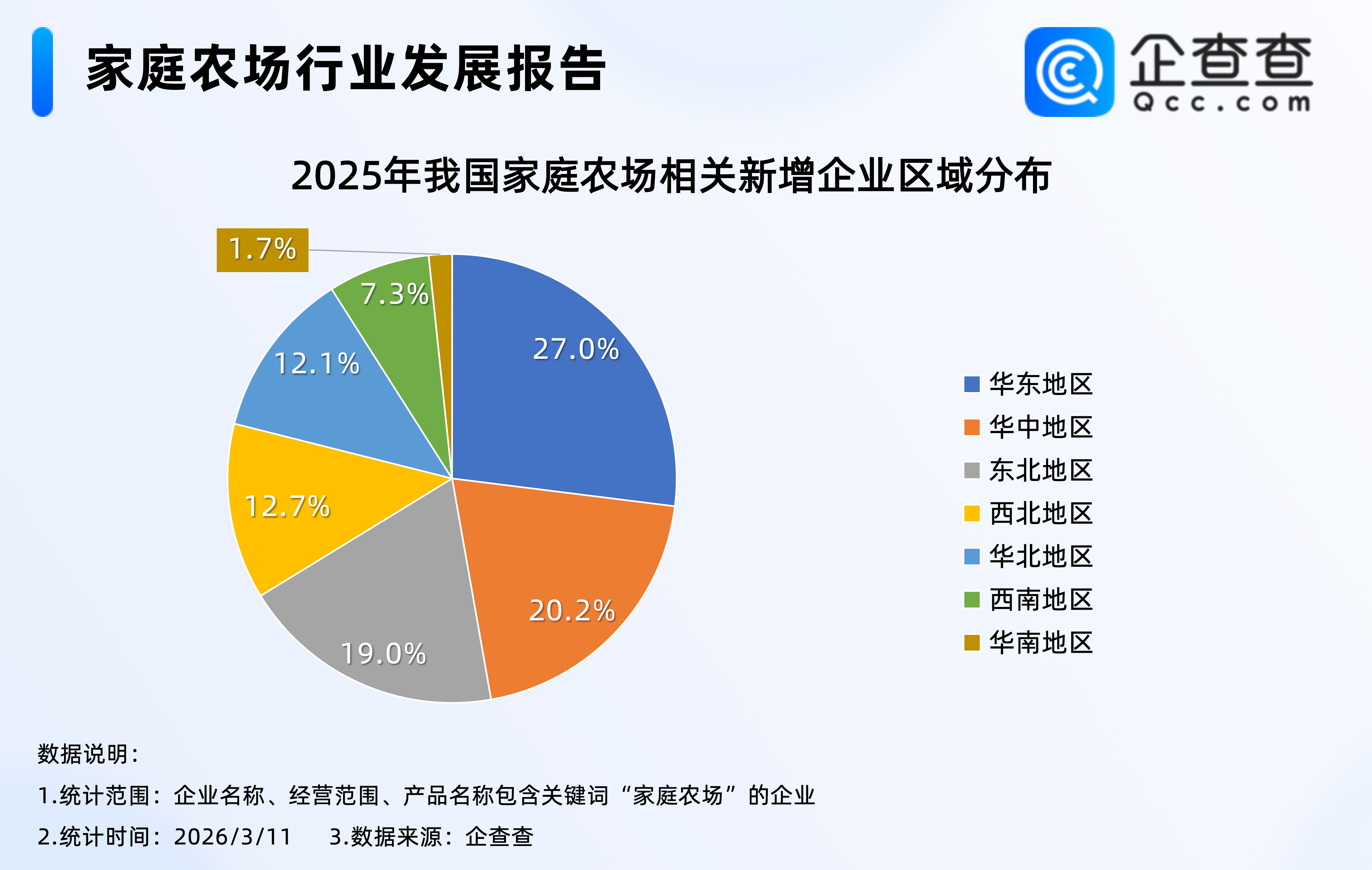 企查查數據顯示,2025年新注冊的4.66萬家家庭農場相關企業中,華東地區最多,占比27.0%,其次是華中、東北地區,分別占比20.2%、19.0%,華南地區相對較少,占比1.7%。