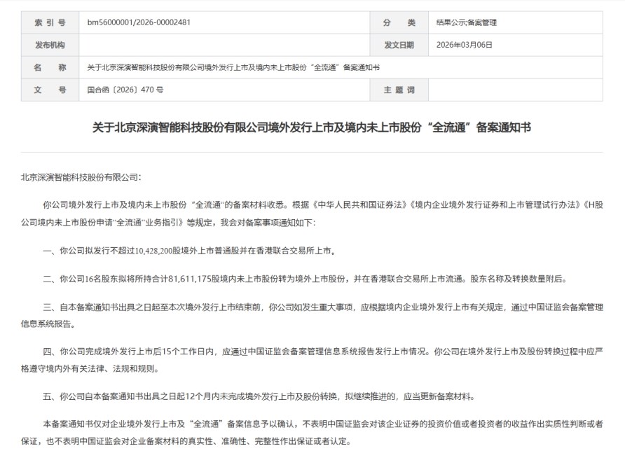 近日,中國證監(jiān)會發(fā)布了關于北京深演智能科技股份有限公司(下稱“深演智能”)的境外發(fā)行上市備案通知書,標志著其赴港上市進程取得關鍵進展。根據(jù)備案通知書,公司擬發(fā)行不超過10,428,200股境外上市普通股并在香港聯(lián)合交易所上市。