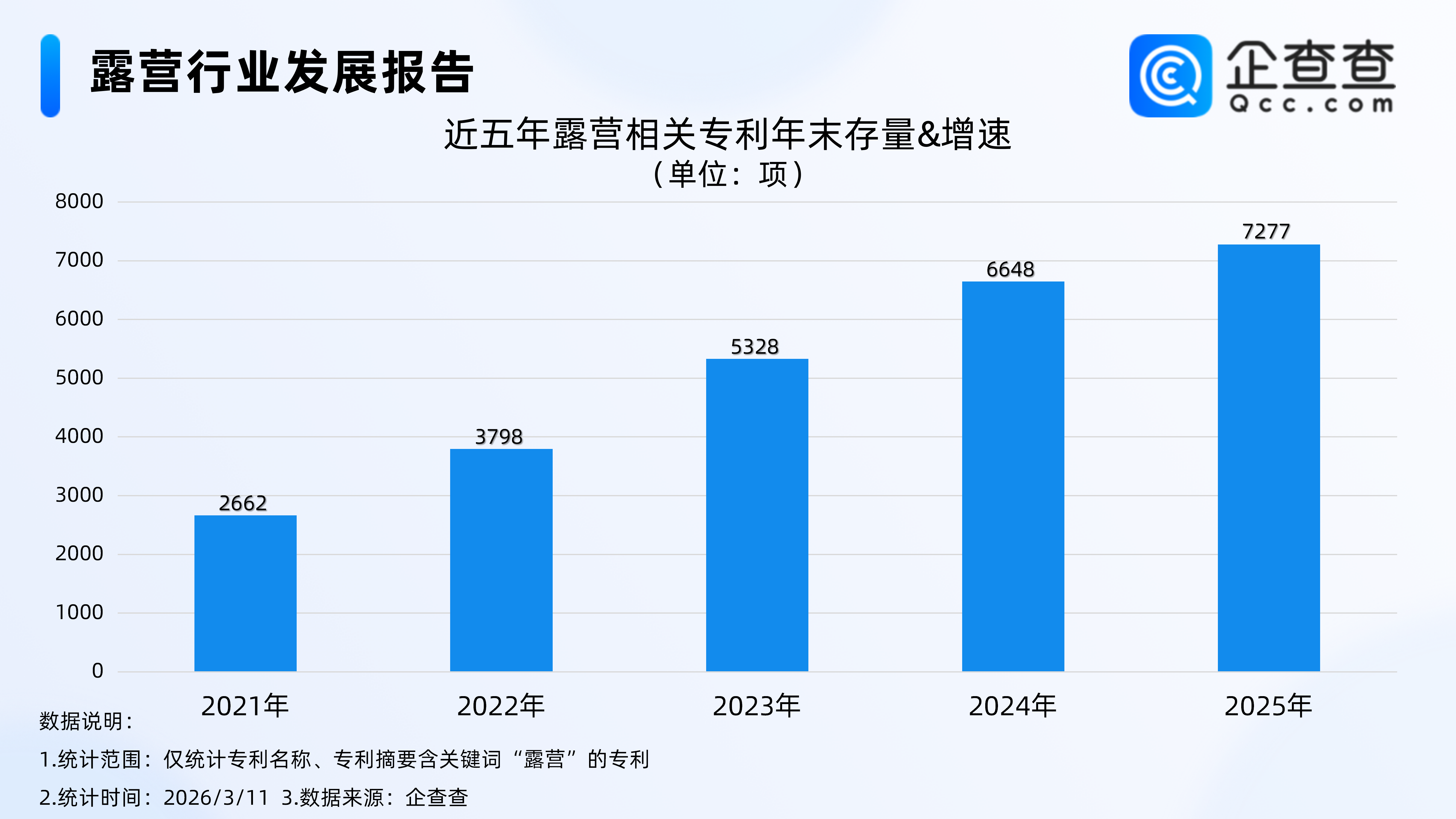 國內露營相關專利的發展態勢直觀反映出行業的創新活力,專利存量逐年攀升,2021年成為露營產業技術創新的重要節點,行業研發和創新投入持續加大。企查查數據顯示,截至統計節點,國內露營相關專利共7000余項,其中近7成申請于2021年及以后,其中,2024年相關專利量升至6648項,2025年進一步增長至7277項,呈現出逐年穩步上升的趨勢。