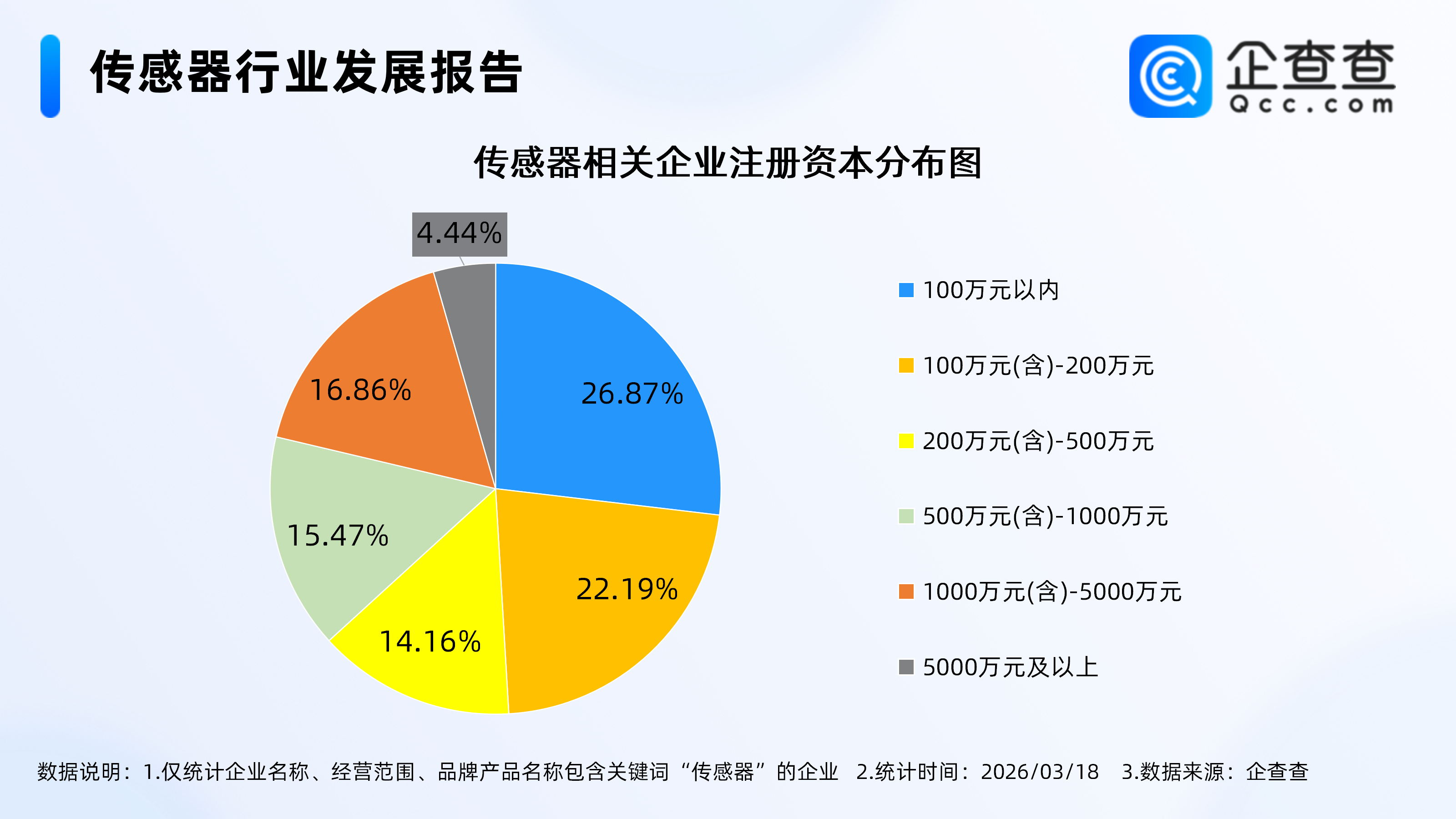 企查查數據顯示,從注冊資本分布來看,傳感器相關企業多為輕量化企業,注冊資本在200萬元以下的相關企業合計占比近半。其中注冊資本在100萬元以內的企業占比26.87%,注冊資本在100萬-200萬元占22.19%。此外,注冊資本在千萬級以上的相關企業合計占比21.31%。
