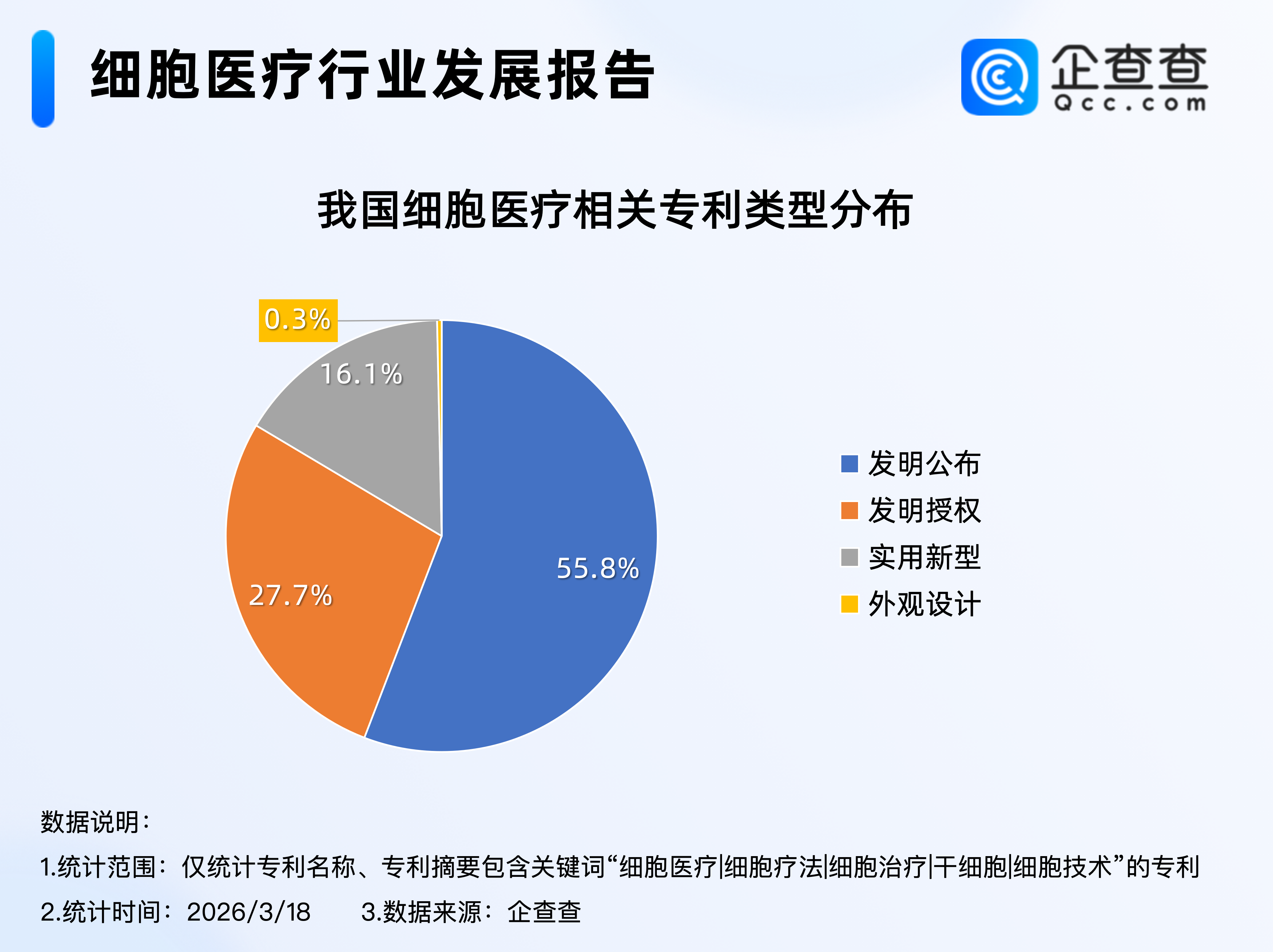企查查數(shù)據(jù)顯示,截至2026年3月18日,我國(guó)細(xì)胞醫(yī)療相關(guān)專利達(dá)3.2萬(wàn)項(xiàng)。專利類型上以發(fā)明公布為主,占比55.8%,其次是發(fā)明授權(quán),占比27.7%,實(shí)用新型占比16.1%。