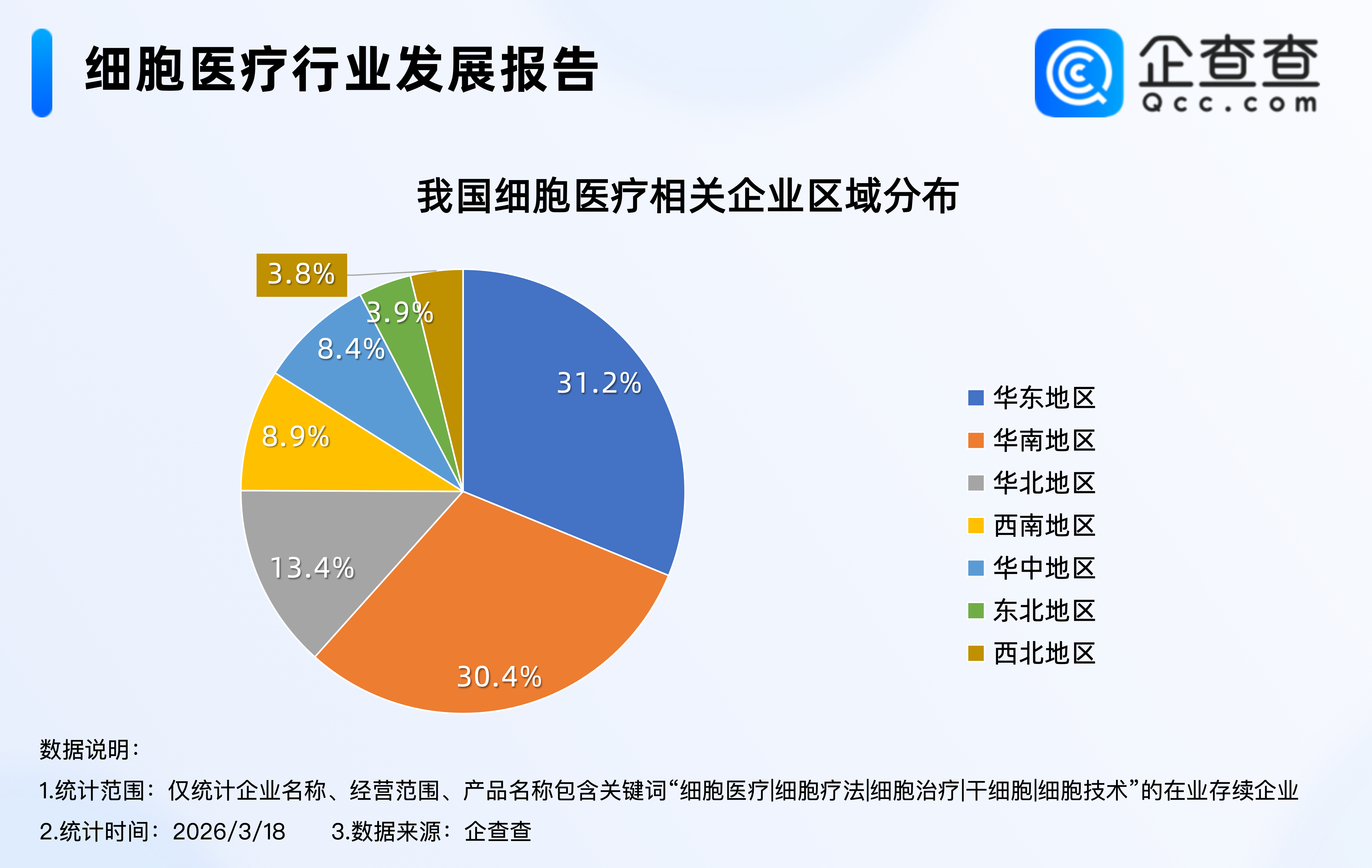 企查查數(shù)據(jù)顯示,截至2026年3月18日,我國(guó)現(xiàn)存14.9萬(wàn)家細(xì)胞醫(yī)療相關(guān)企業(yè),區(qū)域分布上,華東、華南地區(qū)最多,分別占比31.2%、30.4%,東北、西北地區(qū)相對(duì)較少,分別占比3.9%、3.8%。