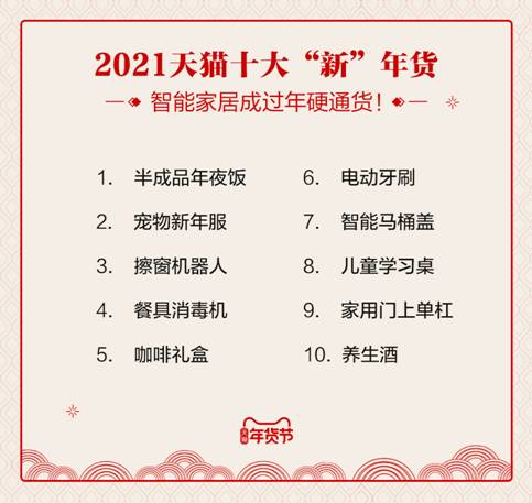 而隨著年輕人接棒“年貨采辦權”,過年清單里也多了不少新物種:半成品年夜飯、寵物新年服、擦窗機器人、凍干粉咖啡禮盒、家用門上單杠、智能馬桶蓋、養生酒等上榜2021天貓增速最為顯著的十大“新”年貨。