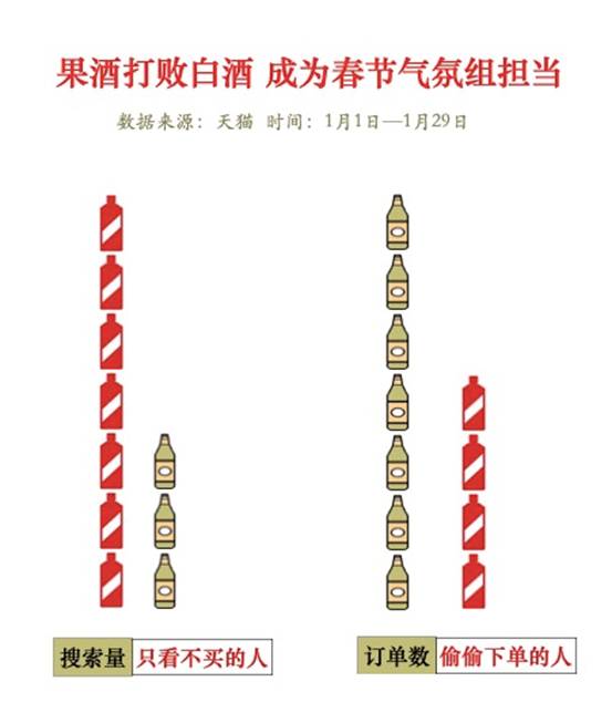 “不容易醉,又能享受微醺的感覺。”當年輕人不參與聚餐后,低度小甜酒正成為年輕人的春節(jié)氣氛組擔當。天貓年貨節(jié)期間,配制酒和果酒的成交訂單數同比去年大漲近120%。分析認為,年輕人對酒類的偏好趨勢以及就地過年帶來聚餐減少,一方面酒的社交屬性減弱,更多地回歸到取悅自己,另一方面也將使得低度酒迎來史上最好的超越機會。