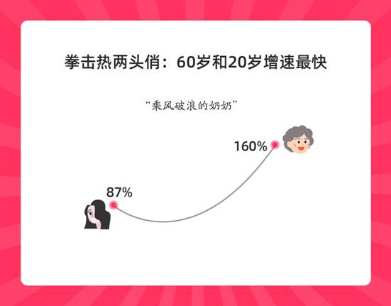 天貓消費洞察顯示,30+女性是拳擊愛好者的主力人群,但60歲以上和20歲以下的00后是增速最快的群體,分別為160%和87%。