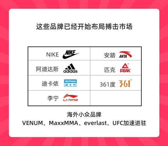 拳擊運動持續升溫,催生出新的消費潮流。體育品牌爭相布局女性搏擊用品賽道。國際運動品牌UnderArmour安德瑪在中國女拳擊運動員張偉麗拿下UFC草量級冠軍金腰帶后,火速簽約,正式布局女性拳擊運動市場。NIKE、阿迪達斯、迪卡儂、李寧、安踏等品牌也相繼推出女士拳擊手套、繃帶、拳擊褲等新品。一些海外小眾品牌也瞄準市場機會,加速進駐天貓,包括法國格斗品牌VENUM、專業拳擊品牌MaxxMMA等。