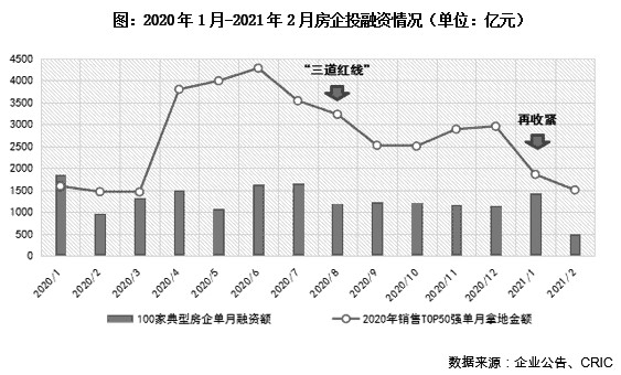 從2020年9月至2021年2月企業的投融資表現來看,“三道紅線”政策對企業的融資端和投資端均有較大影響:融資端,紅線后房企融資額持續低迷,近半年來有5個月融資額同比下滑。2021年2月房企融資額創2017年3月以來新低,僅有504億元。投資端收緊更為顯著,去年9月以來銷售TOP50房企投資金額持續下滑。