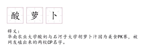 此時,有網(wǎng)友磕起了這兩個大學(xué)的CP,把華農(nóng)酸奶和石河子胡蘿卜汁取名為“酸蘿卜CP”,一舉沖上微博熱搜。石河子大學(xué)學(xué)生還創(chuàng)作了一首酸蘿卜之歌,寫給自己的CP華農(nóng)。看到最終的結(jié)果,石河子大學(xué)的學(xué)生也非常大度,“榜不榜一不重要,甜就完事兒”。華農(nóng)也回應(yīng):活動雖已結(jié)束,愿兩校友誼長存。