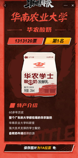 就在投票倒計時不到24小時的時候,華農(nóng)甚至在學(xué)校里擺起了酸奶宴,只要投票就能免費喝酸奶。食堂門口人潮洶涌,都是拿著酸奶投票的人。在華農(nóng)學(xué)子的不懈努力下,最終華農(nóng)將領(lǐng)先優(yōu)勢保持到了最后。