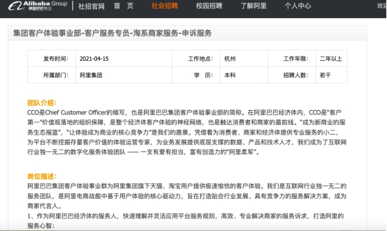 招聘信息顯示,阿里CCO商家服務崗位主要包括客戶服務專員、服務體驗專家、客戶經理等。