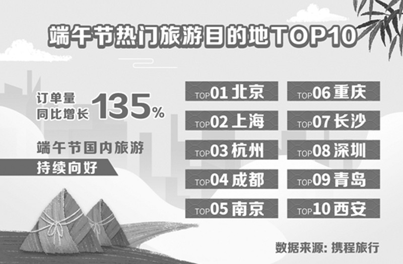 由于今年端午節連休3天,消費者主要以中短途出游為主。攜程數據顯示,近五成游客報名300公里內的周邊游;超六成游客選擇省內游。熱門目的地方面,北京、上海、杭州、成都、南京、重慶、長沙、深圳、青島、西安位列最熱門目的地前十名。