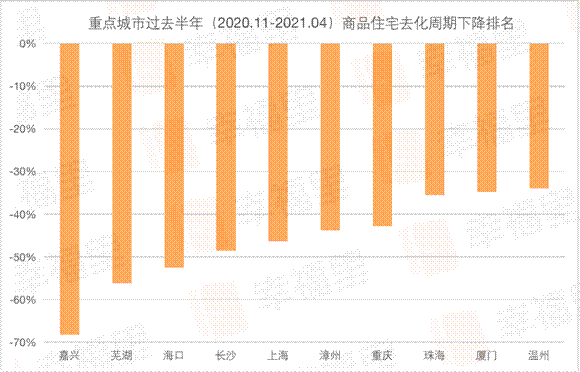 而從過去半年(2020年11月-2021年4月)去化周期情況變化來看,部分城市去化周期下降很快,嘉興、蕪湖、海口去化周期甚至出現腰斬現象。嘉興去化周期更是從2020年底的15個月,下降到2021年4月份的5個多月,去化周期降低幅度最大。