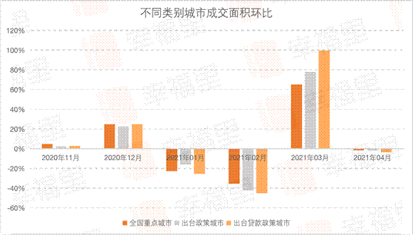 2021年3月,各類別城市商品住宅成交面積環比漲幅差距顯著增大,全國重點城市商品住宅成交面積環比上漲超60%,出臺政策的城市環比上漲近80%;出臺貸款相關政策的城市環比上漲近100%,遠超全國平均水平。