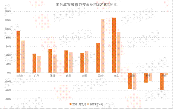 由于2020年受疫情影響,各城市成交數據不足以反映市場真實需求,因此用2021年3月、4月與2019年3月、4月新建商品住宅成交面積數據進行對比分析。