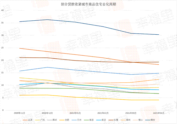 而廣州、深圳過去半年(2020年11月-2021年4月)商品房去化周期分別下降30%和28.3%。在出臺貸款收緊政策的城市中僅次于合肥。目前南京、武漢等去化周期下降較快的城市僅收緊公積金貸款政策,在房貸利率上并沒有太大動作,預計這些城市的政策后續還將繼續調整,用政策來抑制旺盛的市場需求,緩解房價上漲趨勢。