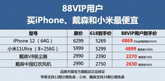 由此,88VIP用戶買各類商品都能獲得最劃算的價格,記者在小米的天貓旗艦店里就看到:用88VIP消費券買小米11 Ultra,最高能省1100元;此外像iPhone 12手機最高也能省1610元。