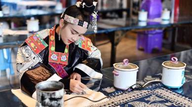 【圖說:“天才媽媽”公益項(xiàng)目支持下,丹賽蠟染傳承人王欣穎獲得了全新的發(fā)展機(jī)會】