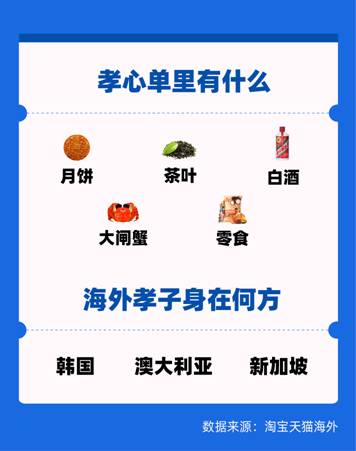 天貓淘寶海外數據顯示,今年中秋節前夕的9月1日-9月15日,有超1000萬海外華人購買中秋相關商品,其中“孝心單”數量增長同比翻番,韓國、澳大利亞、新加坡的華人最有孝心,這三個國家下單人數最多。