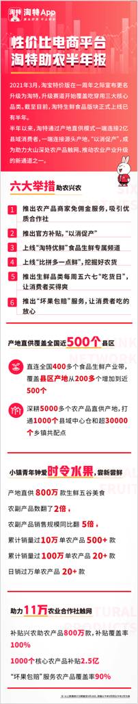 同時,淘特在官方補貼、“吃貨日”、“壞果包賠”等活動、服務激勵下,淘特推動2億新消費人群帶動全國400多個農副產品產業帶觸網,帶動直供產地覆蓋縣區從200多個增加到近500個,助力農產品產業升級。