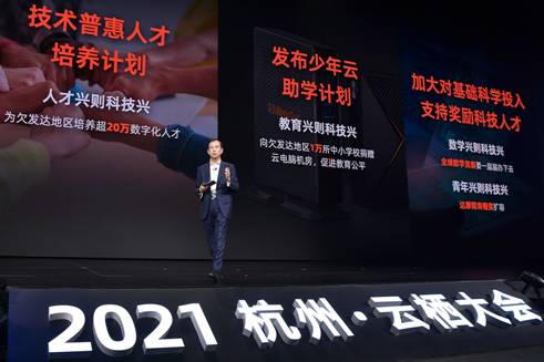 會上,張勇宣布阿里巴巴正式啟動“少年云助學計劃”, 向10000所欠發達地區的中小學校捐建“云電腦機房”,助力改善欠發達地區中小學校的科技教育。這也是阿里巴巴助力共同富裕的又一具體行動。9月初,阿里巴巴發布“助力共同富裕十大行動”,包括“加大科技投入,扶持欠發達地區數字化建設”等。