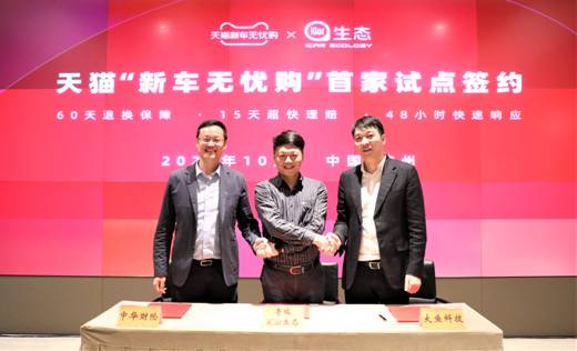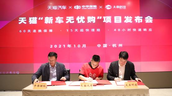 (天貓汽車整車業(yè)務(wù)總經(jīng)理樊偉俊、中華財(cái)險(xiǎn)浙江分公司總經(jīng)理王靖瑋、大魚科技CEO吉煒共同簽署項(xiàng)目發(fā)布確認(rèn)書)