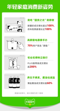 “今年雙11期間,90、95后年輕人正在引領家庭消費中的新趨勢,他們組建起的新家庭,在日常消費上呈現出個性、多元的新特點?!碧熵埑邢嚓P負責人表示。