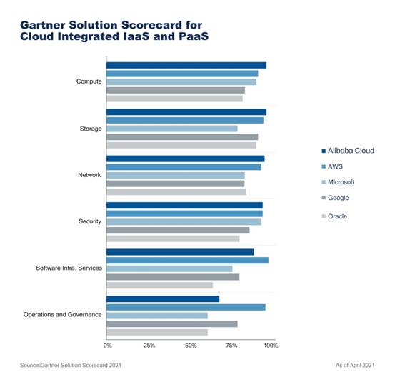 《Gartner Solution Scorecard 2021》是業內最權威的云計算評估報告之一,評估對象包括亞馬遜、微軟、阿里巴巴、谷歌、IBM和Oracle等全球頂級云廠商,評估維度包括計算、存儲、網絡、安全、軟件基礎設施、穩定性、運營、數字業務基礎設施等9大類和270個子項。