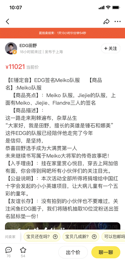 EDG上閑魚賣閑置:簽名隊服拍出上萬元,全部所得將捐贈公益項目