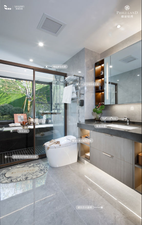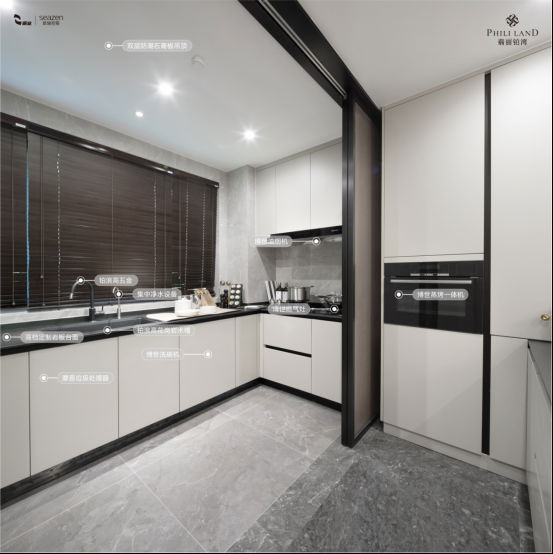 廚房的博世“蒸烤一體機(jī)、油煙機(jī)、洗碗機(jī)、燃?xì)庠睢彼募淄瑫r(shí)還人性化的增加摩恩垃圾處理器。廚房臺(tái)面、玄關(guān)臺(tái)面,全部嚴(yán)苛甄選勞倫金黑色巖板,無(wú)主燈懸浮吊頂設(shè)計(jì),這是奢華酒店級(jí)的觀感。從這些細(xì)節(jié)可以看出,翡麗鉑灣致力于呈現(xiàn)一個(gè)現(xiàn)代豪宅的決心,從構(gòu)思到執(zhí)行,從選材到精工,都可以感受滿(mǎn)滿(mǎn)的誠(chéng)意。