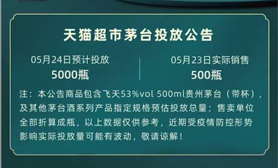 5月24日,記者關注到天貓超市早間更新了茅臺投放公告,今日預計投放原價茅臺5000瓶,是各大平臺中,率先開啟618茅臺放量的。