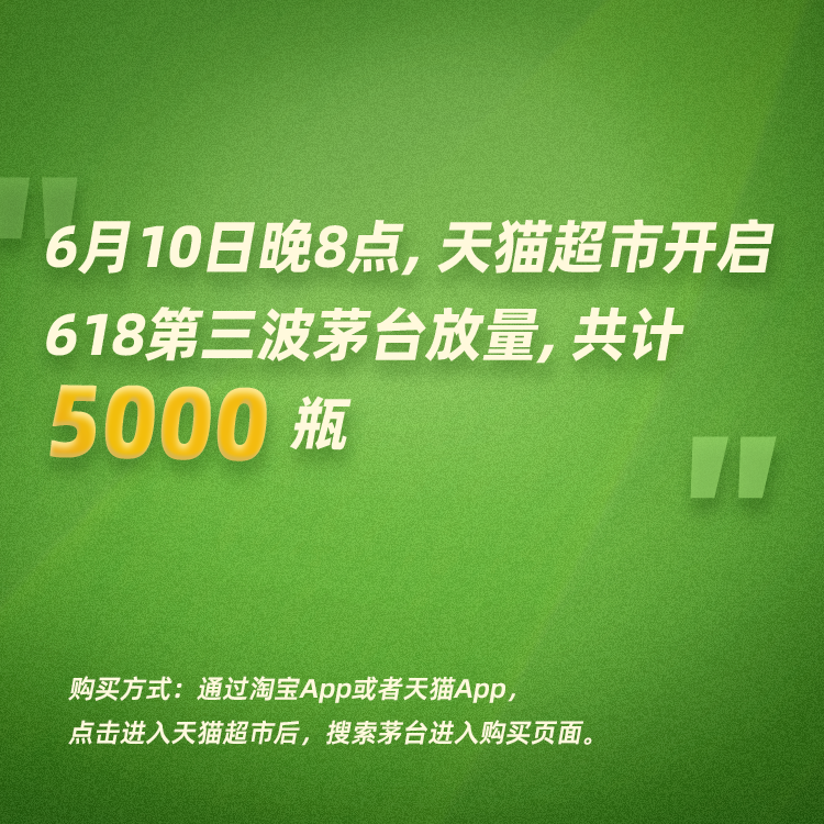 6月10日早間,天貓超市更新茅臺投放公告,當日預計投放5000瓶茅臺,開啟了618期間的第三波放量。