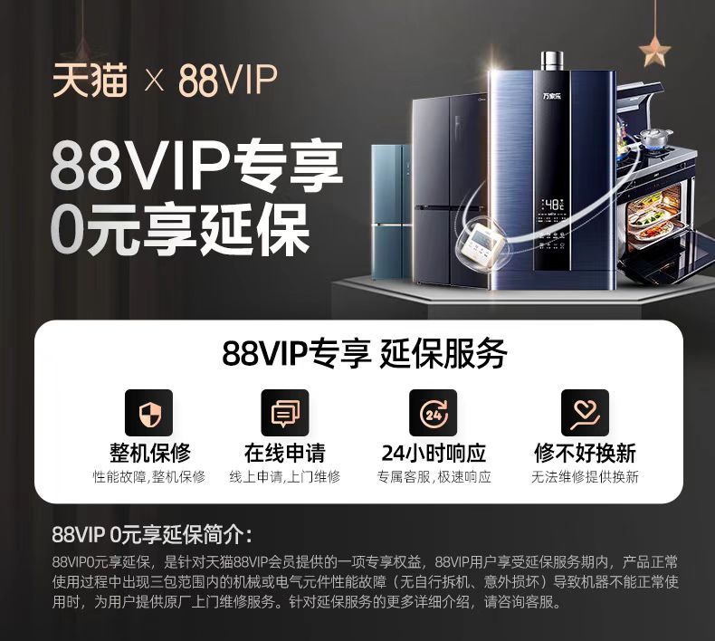 據了解,天貓平臺上的主流家電品牌都已參與這項延保服務。在接下來的天貓618活動期間,12日及15到20日,新老88VIP用戶都可使用這一專屬權益。