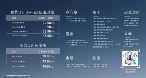 8月23日晚,劃時代智臻豪華全能MPV騰勢D9正式上市,新車在此前預售車型上增加了一款EV純電版車型,共推出2個版本7款車型,售價區間為32.98萬元-45.98萬元,和1款創始限量版車型售價66萬元。作為騰勢品牌破局高端新能源MPV的扛鼎之作,騰勢D9憑借比亞迪技術背書和奔馳品質標準賦能,開創了高端MPV新豪華時代,提供DM-i和EV兩種動力,為用戶打造出宜商宜家的全場景出行體驗。
