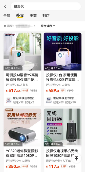 記者上美團(tuán)搜索“投影儀”,發(fā)現(xiàn)在自己家附近,多家數(shù)碼文具店、商超有售。北京西城區(qū)廣安門附近一家數(shù)碼店老板表示,自從門店上線美團(tuán)后,陸陸續(xù)續(xù)有顧客用外賣下單小數(shù)碼產(chǎn)品。“世界杯前一周開始,店里下單投影儀、小音箱的顧客明顯多了。”