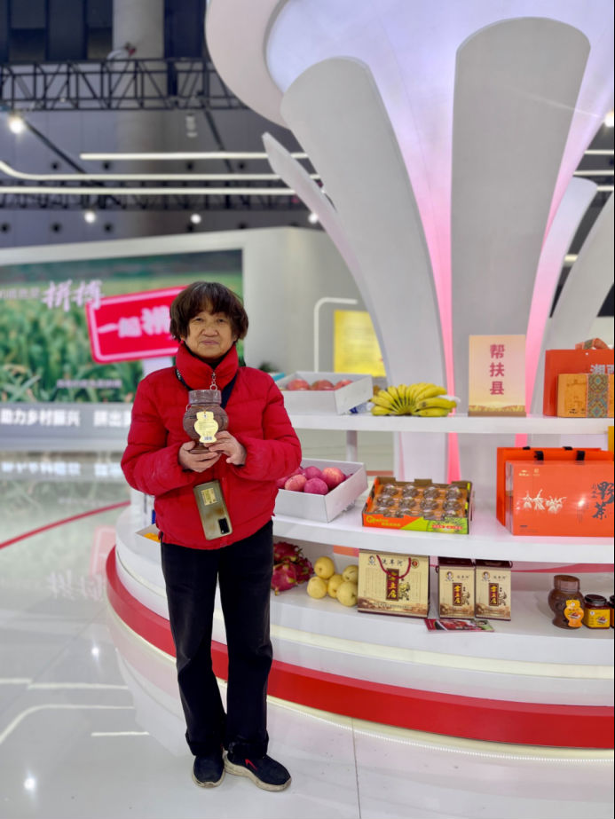 △今年71歲、來自湖南省龍山縣的霉豆腐非遺傳承人劉金霞,帶著特色產品亮相農交會拼多多展臺。沙棘 攝