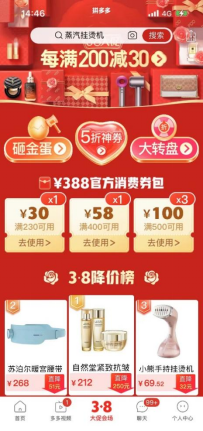 ▲在38大促期間,拼多多將額外發(fā)放388元滿減消費(fèi)券包,助力女性消費(fèi)持續(xù)復(fù)蘇。