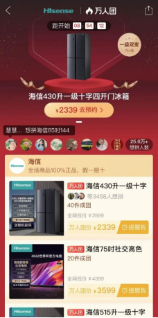 3月3日,海信品牌專場將正式登陸拼多多38大促主會場。此外,海信旗下冰箱、電視、空調(diào)、洗衣機(jī)等近30款產(chǎn)品也將在萬人團(tuán)頻道同時開團(tuán)。據(jù)拼多多APP頁面顯示,在距離開團(tuán)還有9小時的預(yù)熱階段,海信萬人團(tuán)專場已經(jīng)吸引了25.6萬人參與。