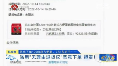 無錫市新吳區人民法院法官助理劉立群介紹:“當時王某下單的時間在2022年10月份,接近‘雙十一’大活動。商家也陳述說,就是因為他頻繁下單退單,致使商家評分不高,導致商家沒有參與‘雙十一’活動,日銷售額遭受很大影響,商譽也有影響。”
