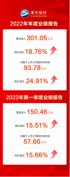 4月25日晚,洋河股份披露了2022年年報(bào)及2023年一季度報(bào)。報(bào)告顯示, 2022年公司實(shí)現(xiàn)營(yíng)業(yè)收入301.05億元,同比增長(zhǎng)18.76%;歸屬于上市公司股東凈利潤(rùn)93.78億元,同比增長(zhǎng)24.91%。同步發(fā)布的2023年一季度報(bào)顯示,一季度實(shí)現(xiàn)營(yíng)業(yè)收入150.46億元,同比增長(zhǎng)15.51%;歸屬于上市公司股東凈利潤(rùn)57.66億元,同比增長(zhǎng)15.66%。